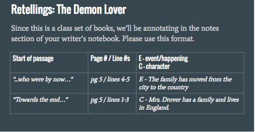 Over the next few weeks, we will read and work with two texts that share the same title: "The Demon Lover." One text is a Scottish ballad that has more than 200 variations; the other is a twentieth-century retelling of this ballad. We will read and discuss each of the texts separately and as a set. Today, students read Elizabeth Bowen's 1945 retelling of "The Demon Lover." As they read, they annotated in their notebooks (see format below) and considered these questions: What is literally happening in this story? and Who are the characters? What do we know about them? Most students were able to complete the reading and some annotations today. Tomorrow, we'll pick up where we left off and have discussions at our tables.